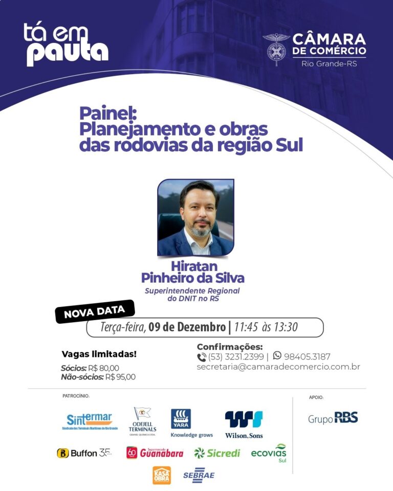 Além das homenagens, o Tá em Pauta abordará um tema de grande relevância para o desenvolvimento logístico e econômico da região: “Planejamento e obras das rodovias da região Sul”. O encontro ocorrerá das 11h45 às 13h30, reunindo associados, empresários e representantes do setor de infraestrutura para um debate qualificado sobre o futuro da malha rodoviária sul-rio-grandense.